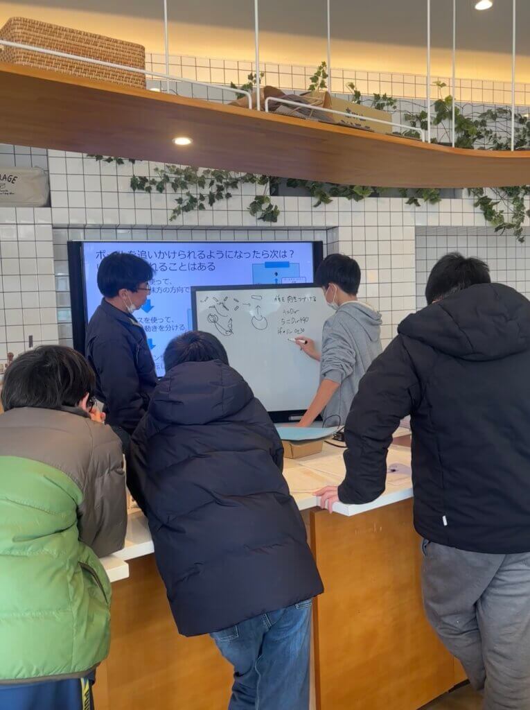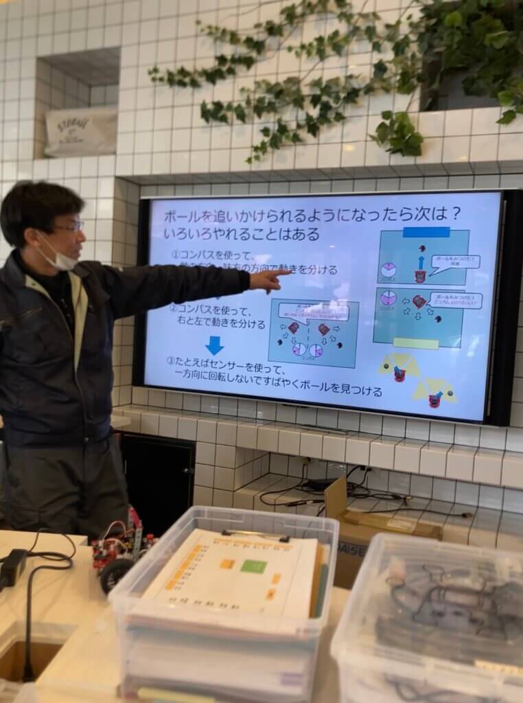 ロボット工作の基本をしっかりと学べる2輪のロボットの生徒と、自由度の高い動きができる4輪のロボットに取り組んでみたい生徒それぞれに向けてホワイトボードを使ってみんな一緒になって勉強する一面もありました。