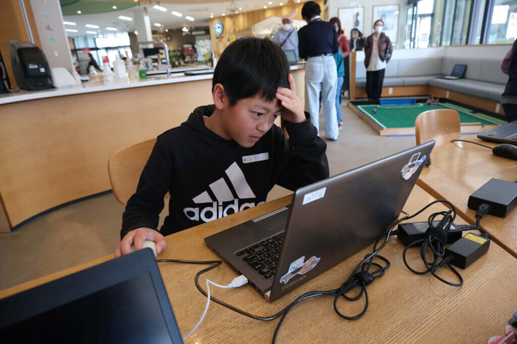 参加者は4年生〜6年生で、マウスやキーボードの操作にはまだ慣れていない子も…。